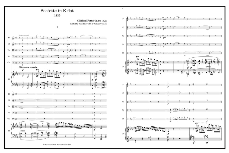 Potter's Sestette for flute, clarinet, viola, cello, contrabass, and piano, one of his last works, was finished in February 1836 and was performed only once, in June of that year. This is its first publication.